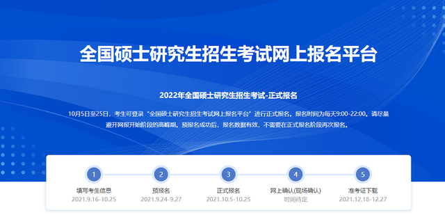 10月5日至25日,2022年全國(guó)碩士研究生招生考試進(jìn)入正式報(bào)名階段。每天9:00-22:00,考生可登錄“全國(guó)碩士研究生招生考試網(wǎng)上報(bào)名平臺(tái)”進(jìn)行正式報(bào)名。